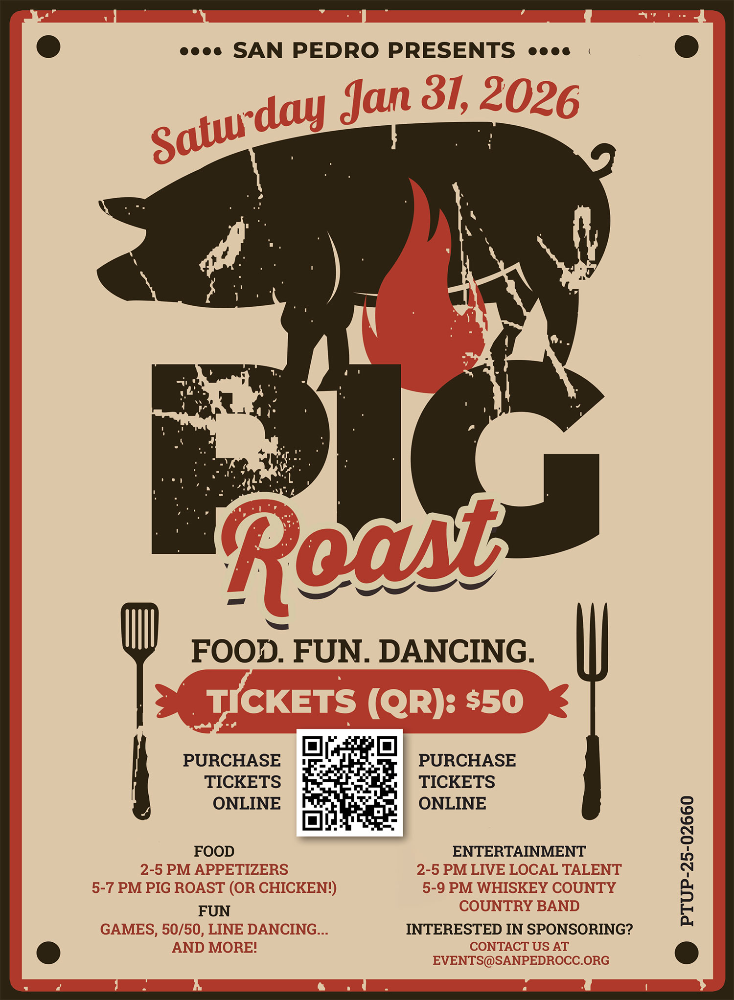 Join us for this event featuring great food, fun, and dancing. Appetizers will be served from 2–5 PM, followed by the pig (or chicken) roast from 5–7 PM. Enjoy games, line dancing, a 50/50 raffle, and live entertainment—including local talent from 2–5 PM and the Whiskey County Country Band from 5–9 PM. Tickets are $50 and can be purchased online using the button above. For sponsorship opportunities, contact events@sanpedrocc.org.